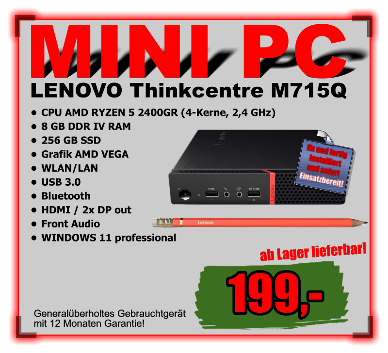 •CPU AMD RYZEN 5 7530U•(4 Kerne Kerne bis 4,5 GHz)•16 GB DDR V RAM•512 GB m.2 NVMe SSD•Grafik AMD RADEON RX VEGA•15,6“ Display NON GLARE•FULL HD 1920 x 1080 IPS •USB 3.0•USB C•BLUETOOTH 4.2 •HDMI•WLAN•integrierte Lautsprecher•Webcam•WINDOWS 11 professional